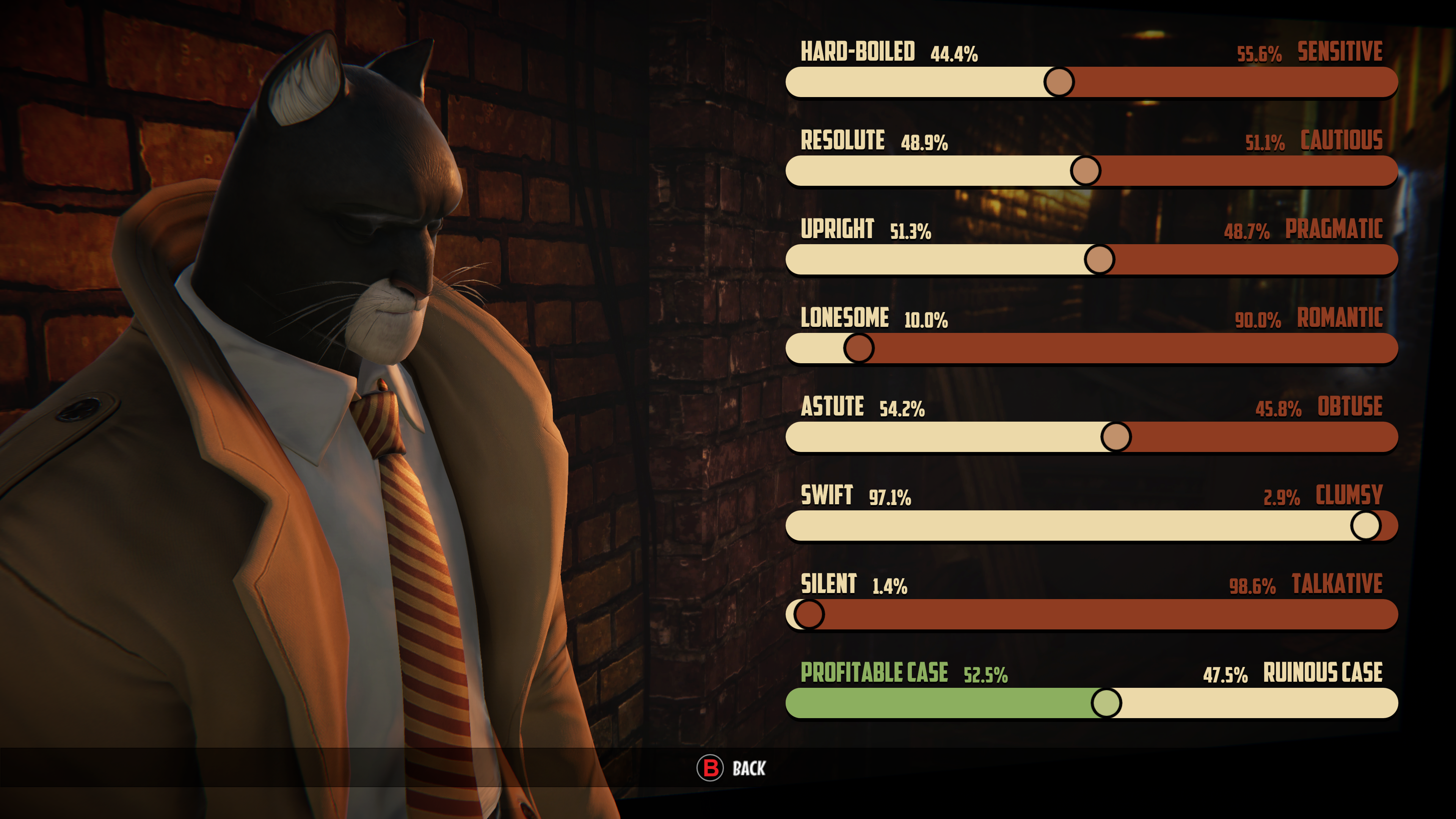 Whilst progressing through the story you’re able to see how your personal Blacksad is shaping up; me being me I was trying to be an honest PI, but if you prefer you characters to have an edge to them then there are plenty of dialogue options to steer your Blacksad in that direction.