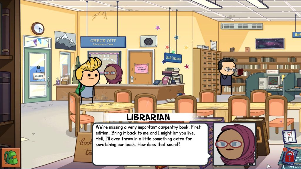 If you’re expecting to form any connection with the characters in the game – don’t. Besides Cooper, they’re all walking stereotypes. When it comes to the Cyanide and Happiness comics online, these stereotypical characters work as they have the spotlight on them for a short moment, the same can be said for the story. When you bring them to a videogame though and try to stretch them for hours it all just becomes bare and lacking. While I understand episode 1 sets introductions, there wasn’t enough to make it feel like its own game. Throughout the episode you’re just doing tasks for different individuals, most of them being fetch quests.