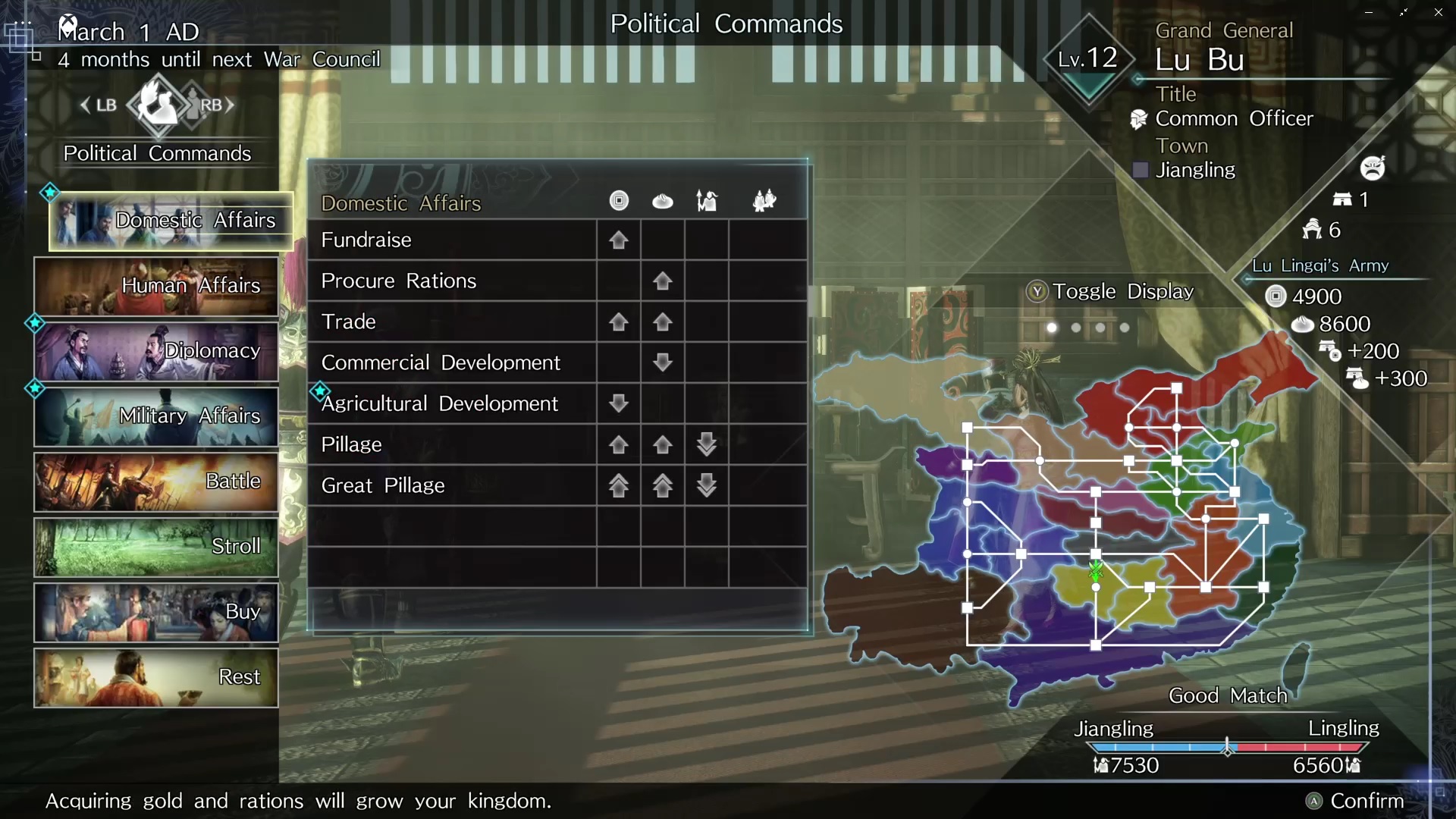 It is structured that you have a war council every 6 months and you have to set your objectives of what you would like to achieve. You can review the domestic affairs where you can improve your resources in the short term in preparation for an invasion or develop your land so you gain more resources each turn and play the long game? Maybe you want to train your soldiers so they are more efficient in suggesting plans or strategies. Or maybe you want to improve their fighting ability so they are more useful in defending or invading. There are many more options to choose from in regards to strolling around talking to your officers to improve your relationship with them or to the unaffiliated to try and recruit them for your cause. You can even try to poach enemy officers or broker a truce with another region to buy you some time to improve your army.