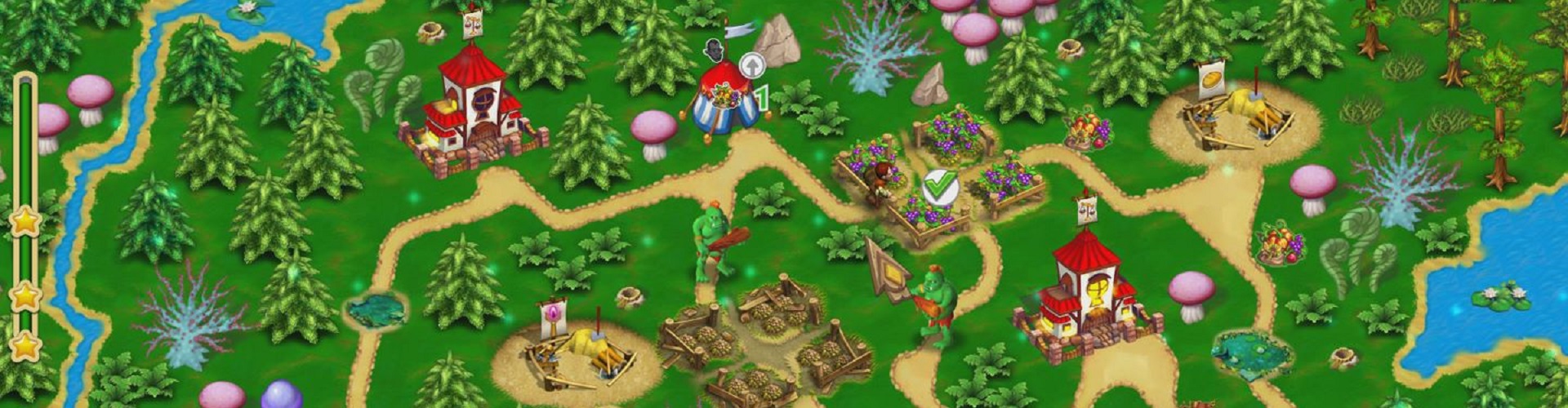 As aforementioned, the difficulty and complexity of each level will gradually rise as you proceed. This much is made apparent on level 2, which has you planting trees, building some structures and chasing away a giant troll. The main loop here is that your tasks tend to feed into one another to some degree. Building a sorcerer’s hut will will grant you the ability to chase away the troll through the use of a magical spell, but in order to access that hut, you’ll need to farm wood to construct a foot-way to overcome a water-filled sinkhole.