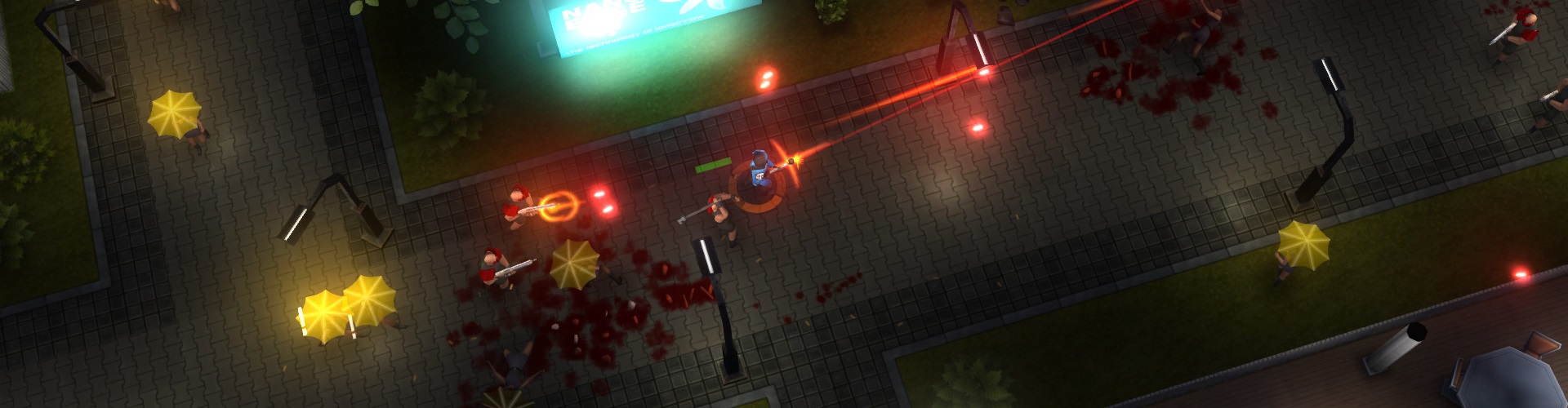 The controls are simple, but then that’s a given when it comes to twin-stick titles. I did have to turn off the auto-aim feature due to it becoming too hectic when multiple enemies are on-screen but outside of that there’s very little to groan about as far as the actual gameplay goes. It helps of course that the game looks good. The theme and setting of the game is futuristic neo-apocalypse, with bright signs and adverts littered throughout the world to light up your environments in a flurry of varying colours. Level design can be somewhat hit-and-miss, often giving you a grid-like map to work through, but it gets the job done nevertheless. It most certainly is not on the same par of quality as (say) RUINER, but it doesn’t exactly skimp on the overall presentation.