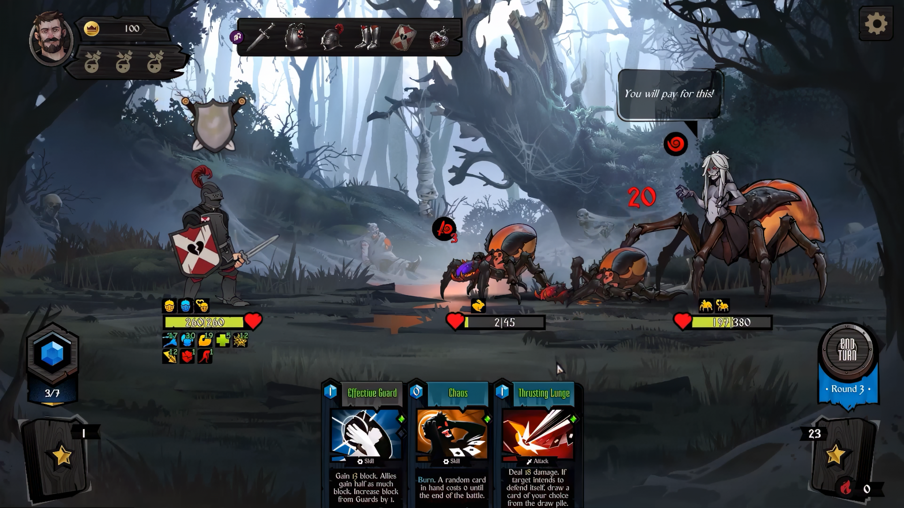 Persival is more conventional in here, he has a pool of energy each turn that must be spent to play most cards, his starting deck is about strikes and shields. While Bjorn uses his own health to play cards (generally all of them are strikes) and must flit between his two forms to attack and heal himself.