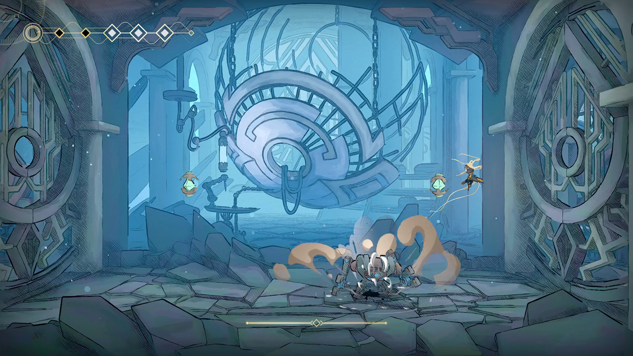 Now that you have your map you can explore more efficiently and see pathways you’ve not yet visited. You’ll quickly find your first boss fight and you’ll probably die. In fact, you’ll probably die a few times. But once you finally defeat the first boss you’ll meet Samsk who provides you with your first mobility upgrade – the Hairpin – which is basically a grappling hook. Every time you get a new mobility upgrade you’ll have to complete a simple 2D tutorial level that requires you to use all of your mobility upgrades up to that point.