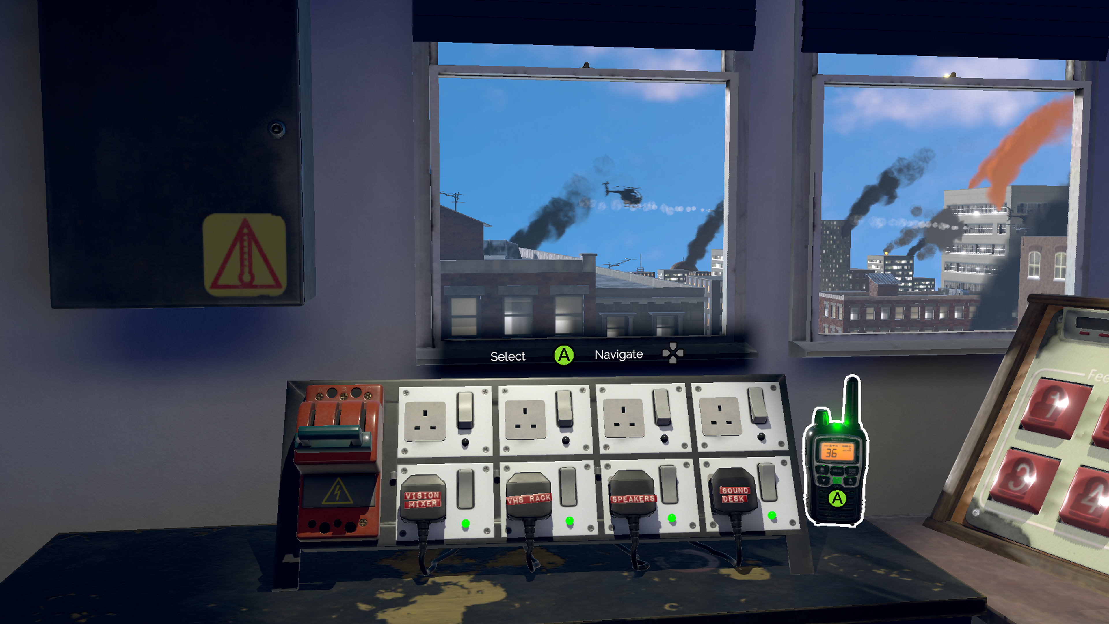 The majority of the game takes place in an editing room where you have a first-person view of all the equipment necessary to edit and produce a broadcast. This user interface layout gives you a large amount of control over each night’s broadcast. At first glance, it might be intimidating, but the game does a fantastic job of introducing you to the different mechanics, with the former editor walking you through the basics over a speakerphone sitting on a table to your right.