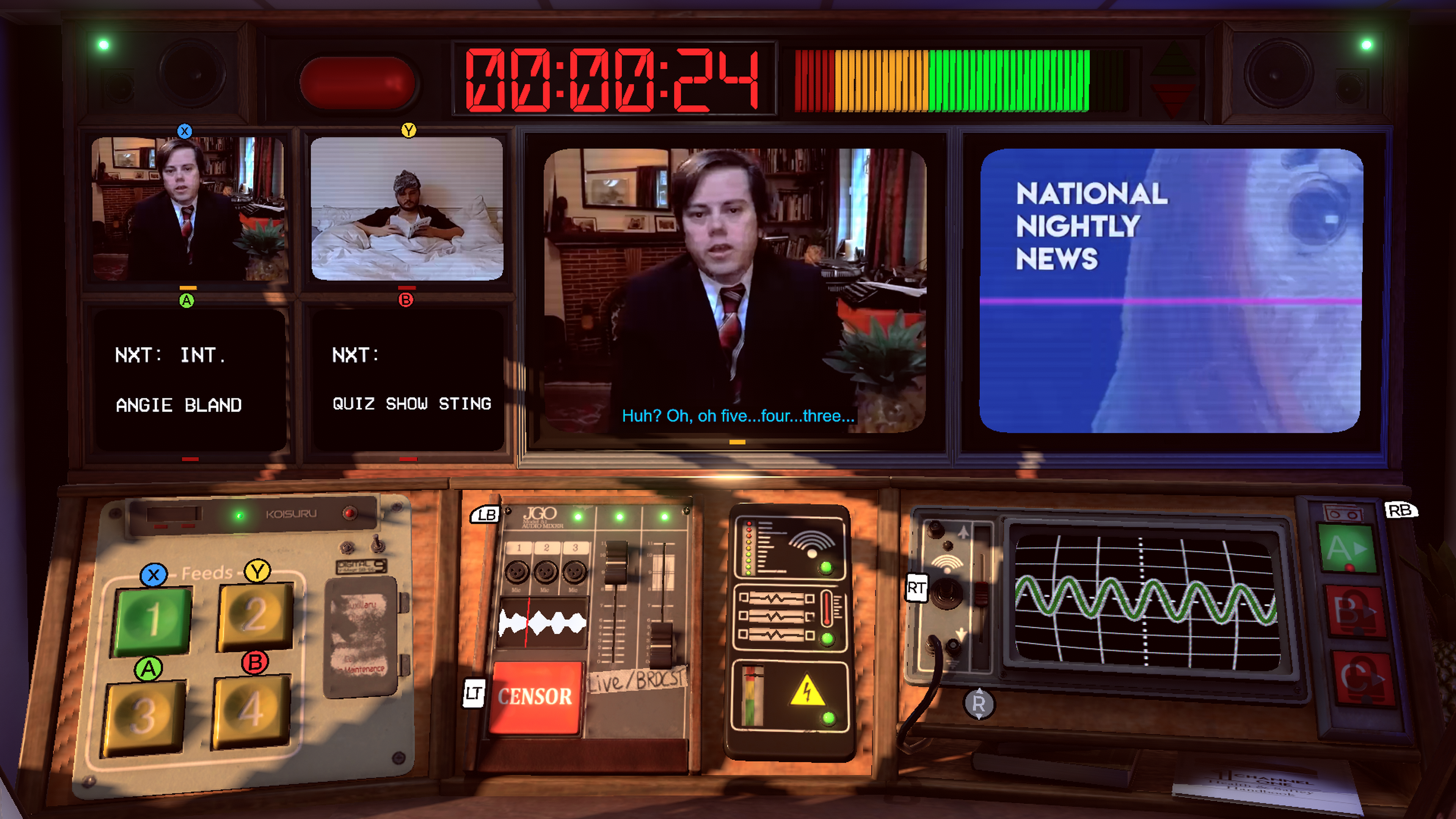 The basics start with you turning on a power board to your left. You must then sort through a selection of VHS advertisement tapes under your desk and select the three you will play during the broadcast by inserting them into a trio of VCR slots. These actions need to be taken at the start of each day in the studio, but after that, you get to the bread and butter of the game. In front of you are six screens. Four small screens on the left are the different feeds coming into the editing room. There are two larger screens to the right which are the live feed screen and broadcast screens (the broadcast screen is delayed roughly 2 seconds). The first mechanic you learn is how to switch between the four cameras. You have four choices, each labeled with one of the four face buttons on the controller. The left trigger activates the bright red dump button on your control panel, allowing you to censor any audio you deem offensive; keep in mind that you have to censor it on the screen with the two-second delay. Luckily the game gives you an audio cue when something should or could be censored and the outgoing sound is even displayed on a tiny screen with the bleepable audio appearing in a different color. The third mechanic introduced in the opening section is interference. On the right side of the control panel is a grid-marked screen with a wavelength stretching across. At certain points during the broadcast, due to shoddy equipment, you have to adjust the wavelength with the right joystick to prevent interference such as distortion and static from contaminating the airwaves. This trio along with the intro and outro responsibilities feels like a great starting point.