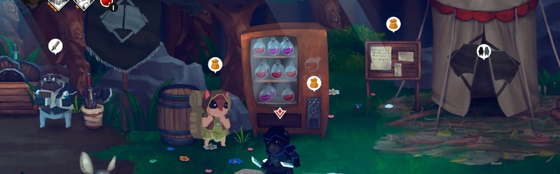 As I said before the game can be tough, one of the most frustrating things is getting stuck in a stunned hit cycle where an enemy or enemies continue to hit you after stunning you with an initial strong attack. Fortunately though if you die you keep everything you’ve gained in the level up until that point – items, experience, and food. Food is the currency in Paw Paw Paw and it can be used at outposts scattered across the map, each one is themed to match the area in which it is found. There are multiple vendors and other helpful NPC’s in each outpost. The Brewhouse will sell you potions and bombs, the Eggs trader, surprisingly, sells… eggs, and the wandering merchant sells weapons, which can be equipped along with the ones you’ve already found at the armory.