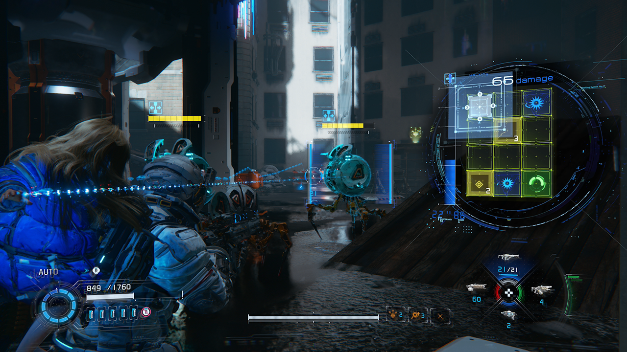 The combat hacking feature is unique from other games in that you are performing the hack at the same time that you’re aiming, shooting, and dodging enemies. Holding down the left trigger will allow you to target a particular robot. When targeting a robot within hacking range, a digital board consisting of squares is overlaid on the top right of the screen. The left stick will allow you to move around the environment while the face buttons, X, Y, A, and B will guide a cursor around the digital board. If you just go straight to the end node, enemies will “open up”, revealing weak points where they take increased gunfire damage. Along the way you can pass through special hacking nodes that add damage or have other special effects on enemies upon reaching the end node. It takes a little time getting used to managing both sets of inputs, but it works! Capcom should be congratulated for creating a brand new gameplay mechanic.
