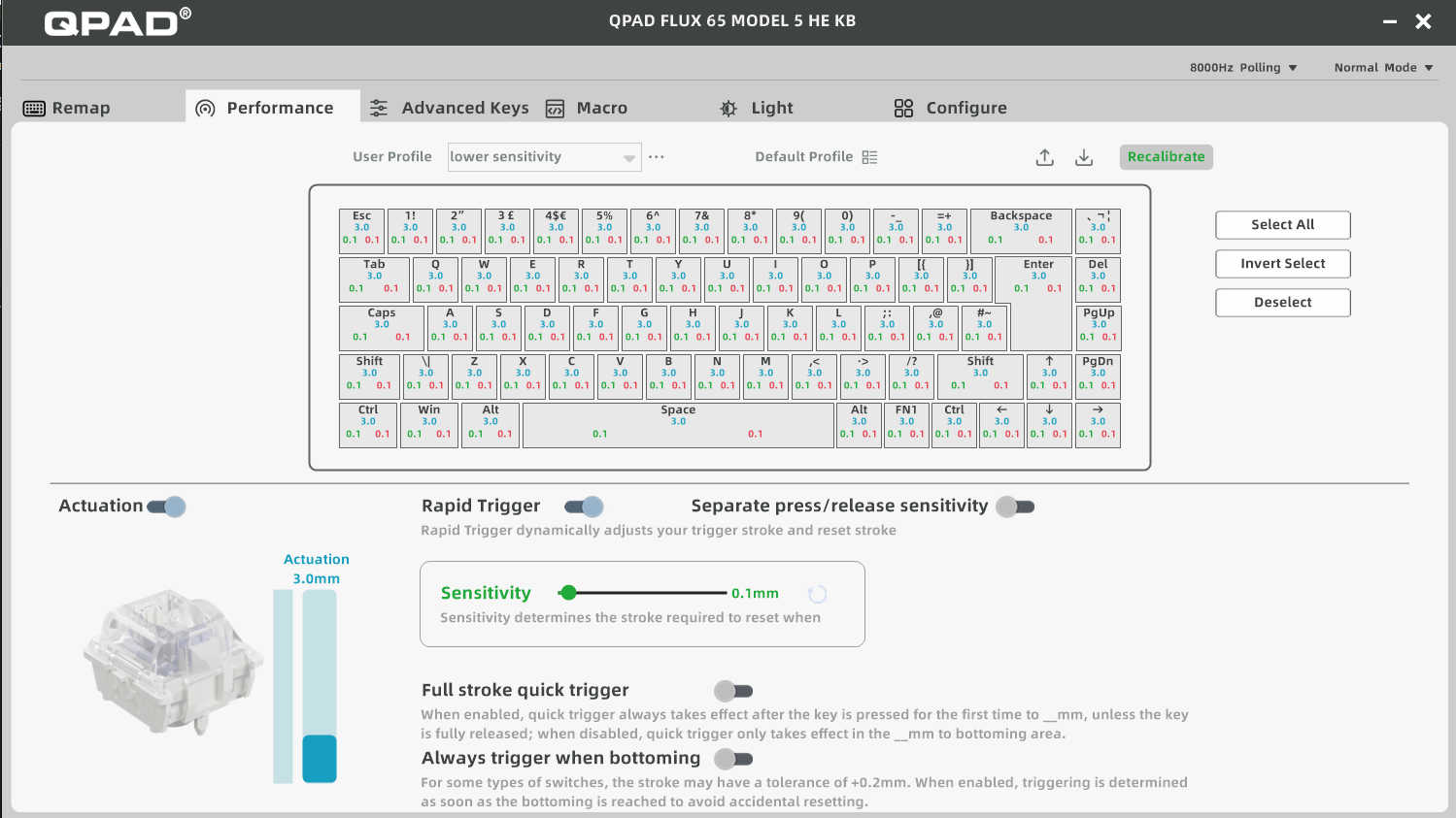 Thankfully, the Flux 65 is fully customisable and so we can adjust to the tenth of a millimetre how sensitive each key is. I hope to be able to train myself to bring it back up to a more sensitive setting one day, but for now I need all the help I can get to avoid accidentally typing all manner of (extra) nonsense.