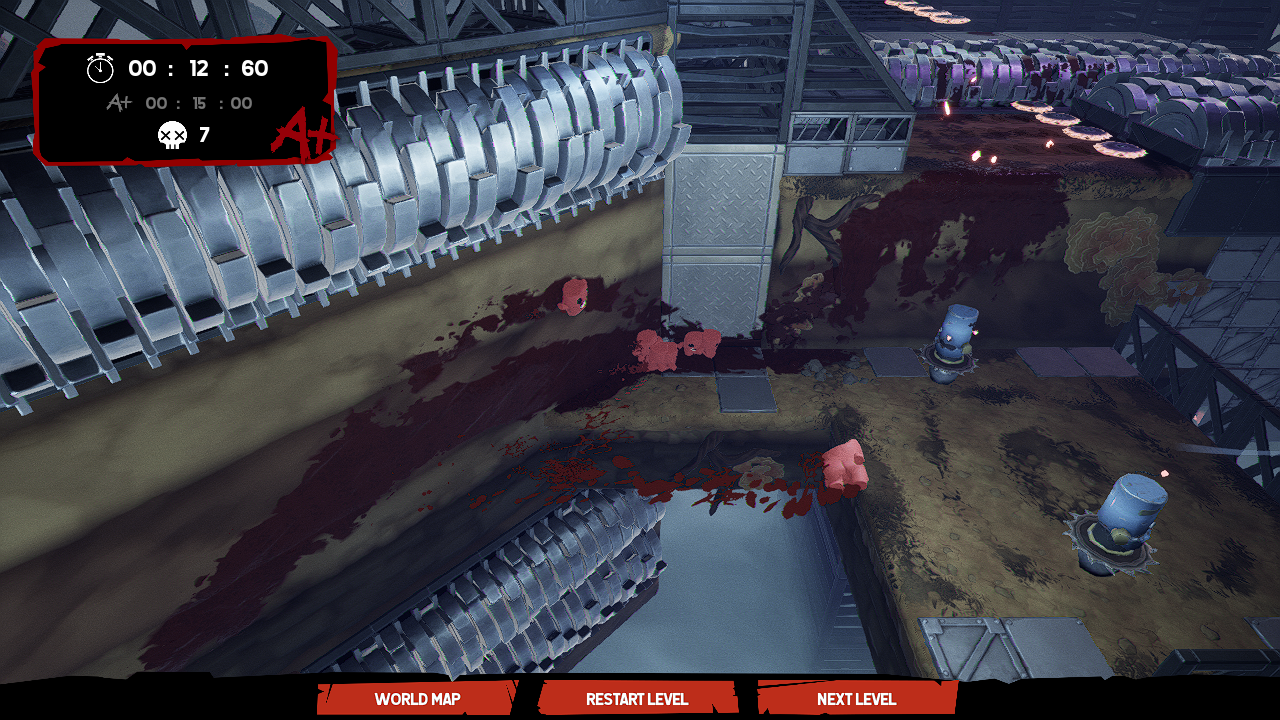 Each level offers a par time, a bandage to collect, and other secrets to discover. Achieving all of these will be an exercise in patience and skill for sure. With fifteen levels per world, there’s a lot to get through, and a boss battle waiting at the end of each that requires not just precise platforming but pattern memorisation as well. These offer a nice change of pace and are a true test of the skills we’ve learnt.
