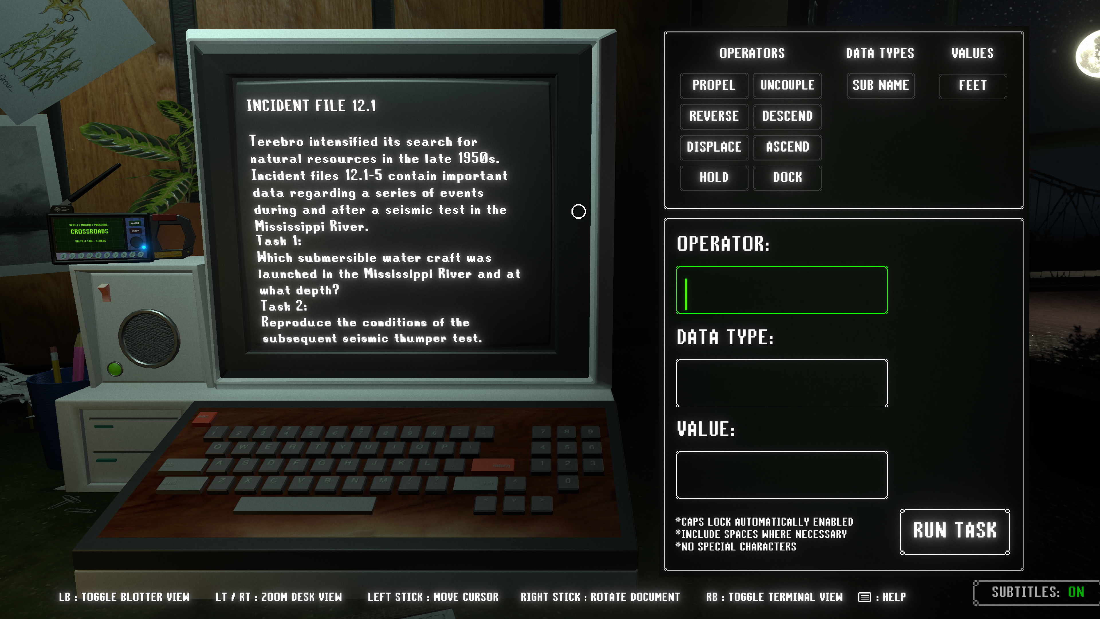 We play as a new Risk Assessment Data Processor for TEREBRO INC. The company hires us to sort through a series of case documents and protect their reputation. The only guiding voice we have is the Supervisor, who tells us over the radio that the information we give him fills in the blanks on the report he has on his end. Other than that, no information (even real names) can be shared. It reminds me of the relationship with the radio in Firewatch; a voice on the end of a line that we have no choice but to trust, but should we?