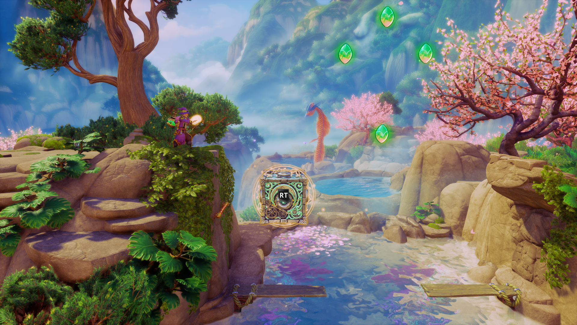 One example had us pulling a lever down to slide a grapple point into place, but this was also tucked away and was tricky to reach. After a few minutes trying to figure out what I was meant to do, I just used Amadeus’ box and plank fused together, raised them into place on the upper ledge and just forwent the actual puzzle in favour of Zoya simply grappling on to that instead and pulling herself up. There were many more examples of us being able to wangle the physics system into a solution that was probably not the intended one, but – much like Tears of the Kingdom – Trine 5 is content to put us in a situation and let us get out of it however we see fit. It’s remarkably freeing to be able to come up with on the fly ideas and give them a try, and rarely were there moments where our creativity was hampered by a forced scenario.