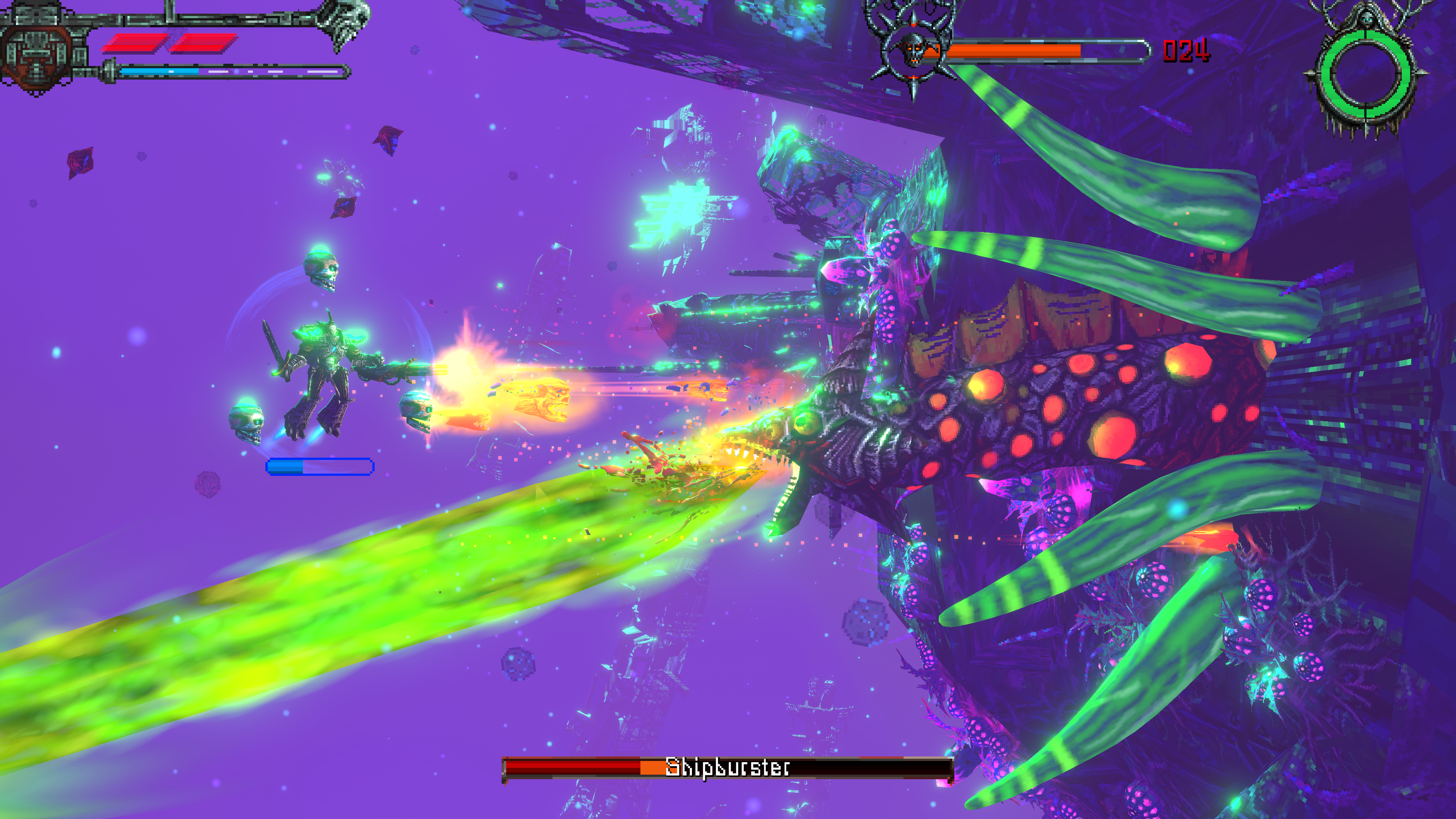 What makes Valfaris: Mecha Therion stand out for us is the sheer awesomeness of the accompanying soundtrack. Its big, meaty metal riffs smash and rip through our speakers as the bullets and enemies provide their vocals. It is – and do take this lightly – one of the most enthralling musical experiences I’ve had in a game in a long time. I couldn’t help but head bang along as I played, and I’ve definitely pushed my headphones to the limit these last few nights.