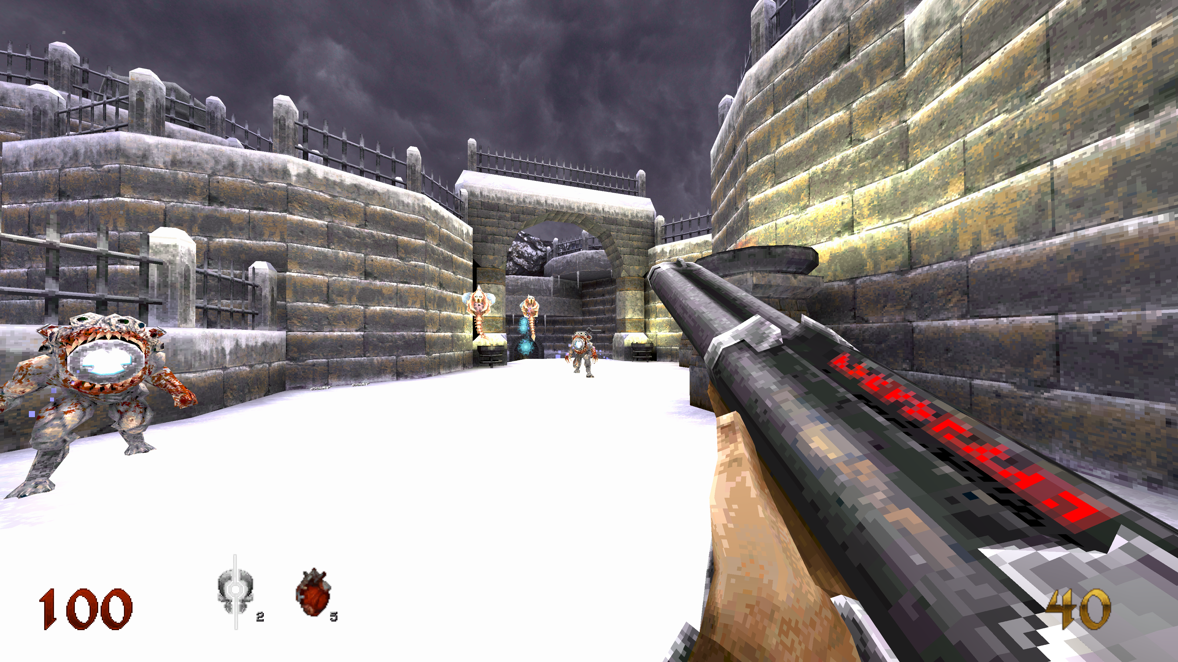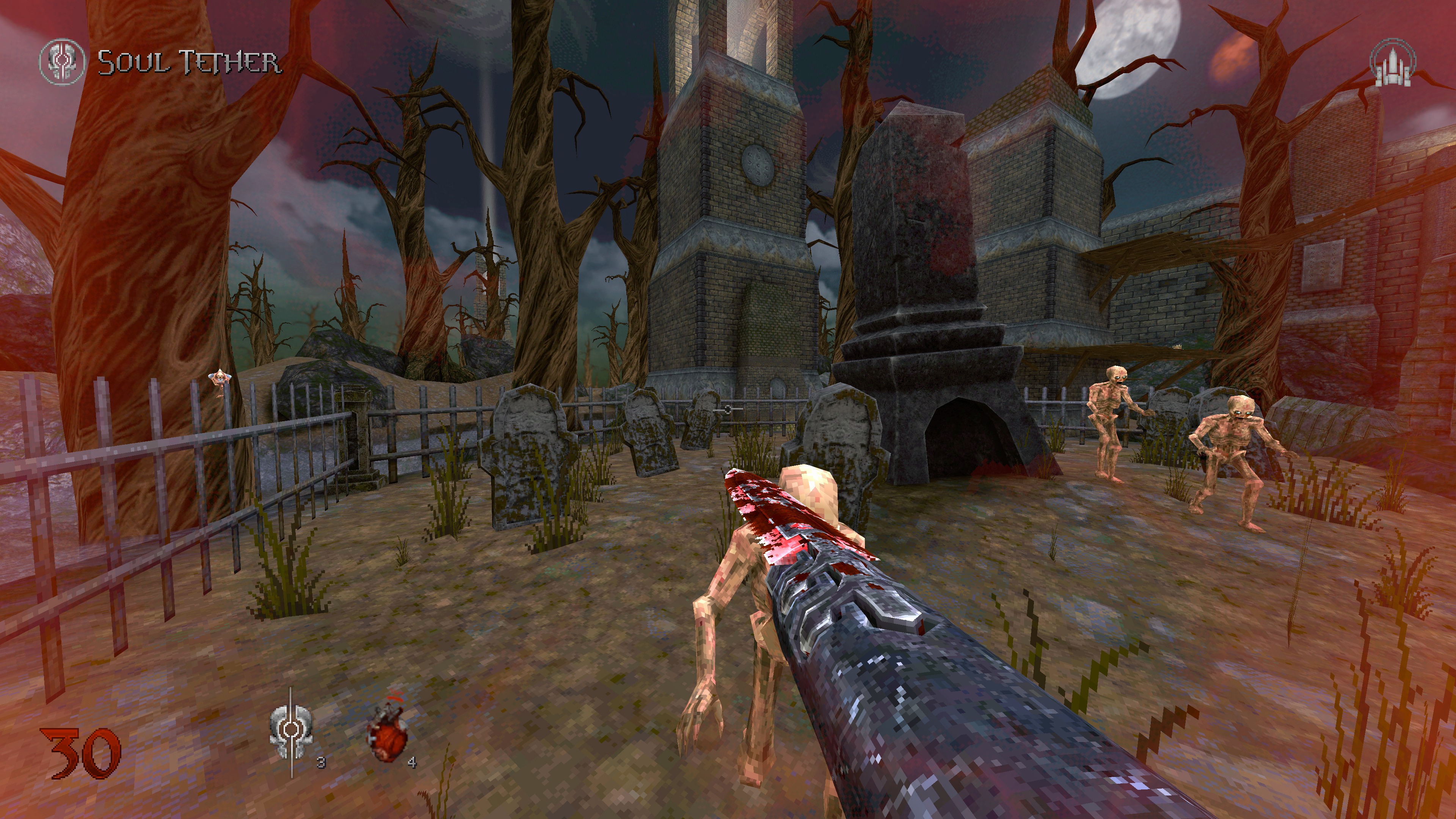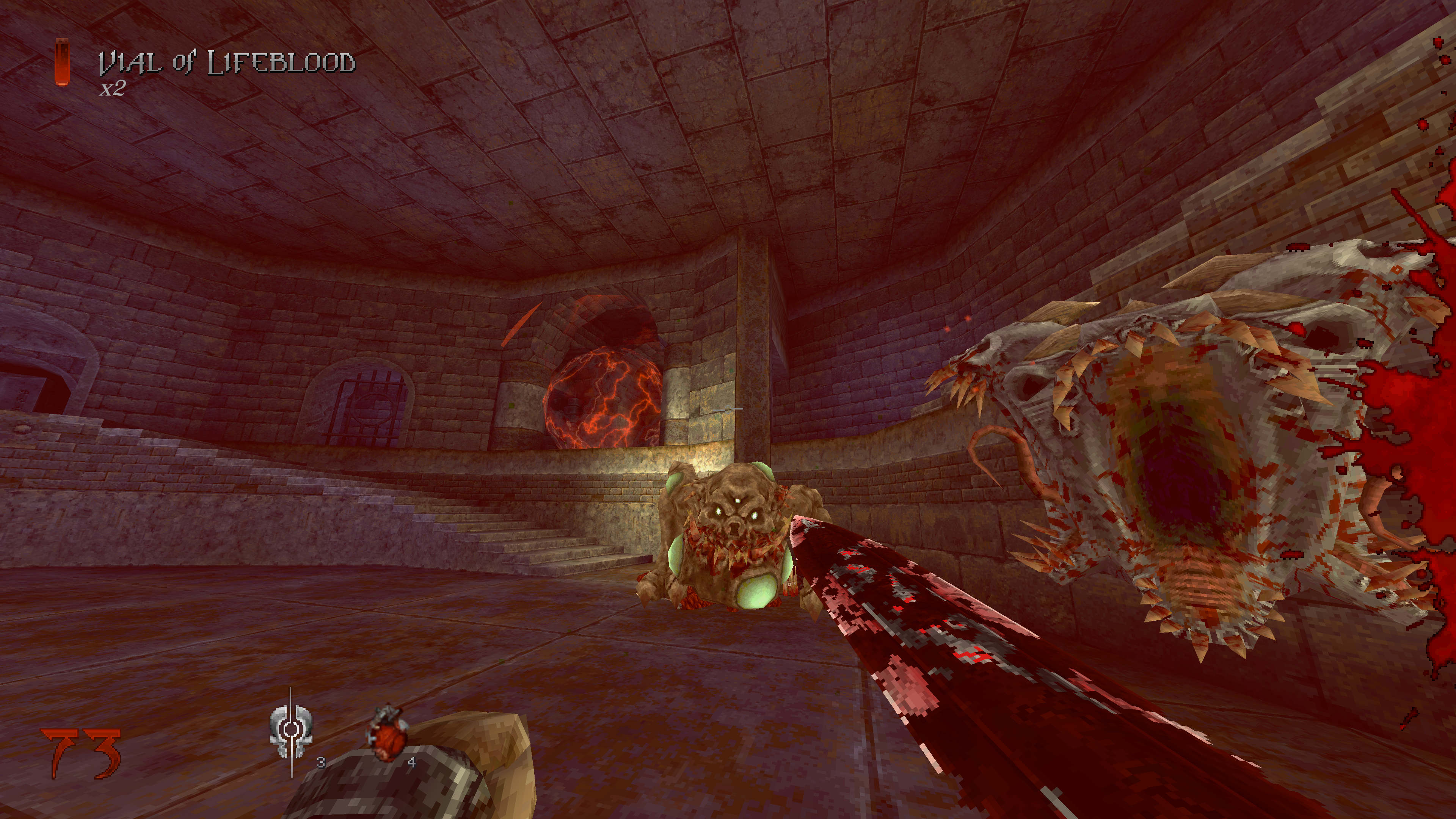 Wrath: Aeon of Ruin is a proper throw back to the early days of first-person shooters – so much so, it’s based on the tech that powered one of the first games I eveR played in the genre, Quake. It’s not just the tech but the feel of the game that apes the ‘90s style, from relentless enemy onslaughts to slightly wonky platforming and difficulty spikes that’ll have us replaying larger chunks of a level a bit too many times. Everything moves at a blistering pace too, even on my 60hz screen it feels like it’s running at about a thousand frames a second. Pair all this with chunky 32-bit style visuals, and we get the aforementioned proper throwback feel.